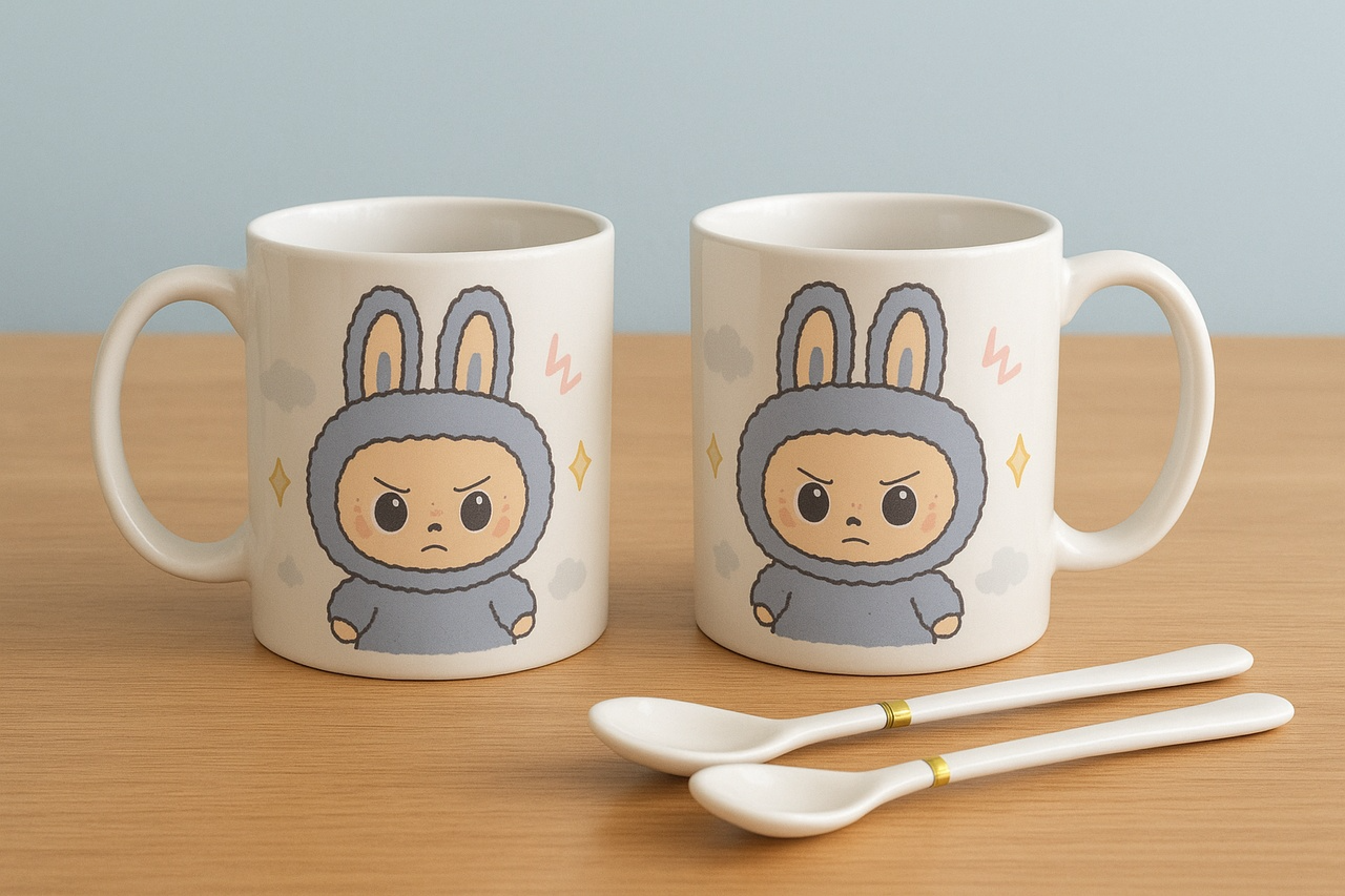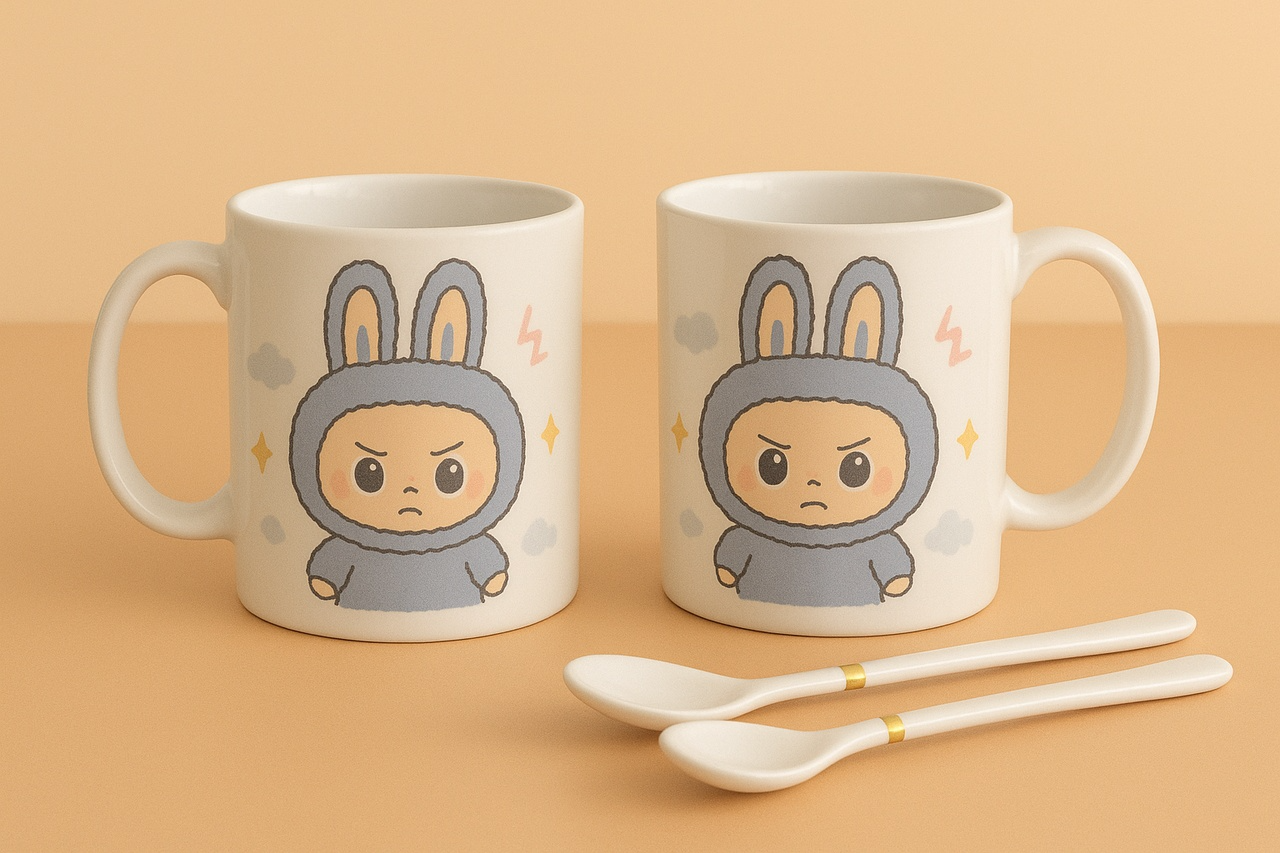 Labubu Cartoon printed Coffee Mug 300ml Set Of 2 Cups and 2 Spoons.